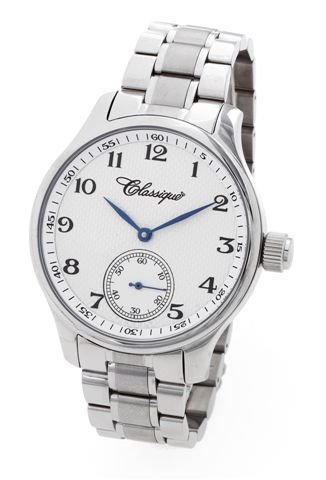- 17-jeweled Swiss Made large mechanical (wind-up) movement with Cote de Geneve engraving and stainless steel blue screws.