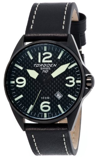 Torgoen Swiss Men's T10105 T10 Stainless-Steel Case Carbon Aviation Watch - A sporty, black leather strap gives the Torgoen Swiss Men's Ion-Plated 3-Rubber Strap Analog Clock a casual attitude. A black ion stainless steel case is topped with a black ion-plated stainless steel bezel. A simple dial carbon fiber large display, luminescent Arabic numeric indicators hour at three, six, nine, and 12 o'clock positions and luminescent indicators, now at right angles to the remaining positions. Large, luminescent hands, white stick minute markers and a date window at 4 clock round the black and white beauty. This clock comes in a fabric lined black case and is water resistant to 330 feet (100 m)., Torgoen Swiss Men's T10105 T10 Stainless-Steel Case Carbon Aviation Watch.